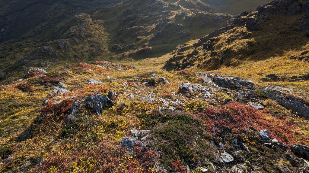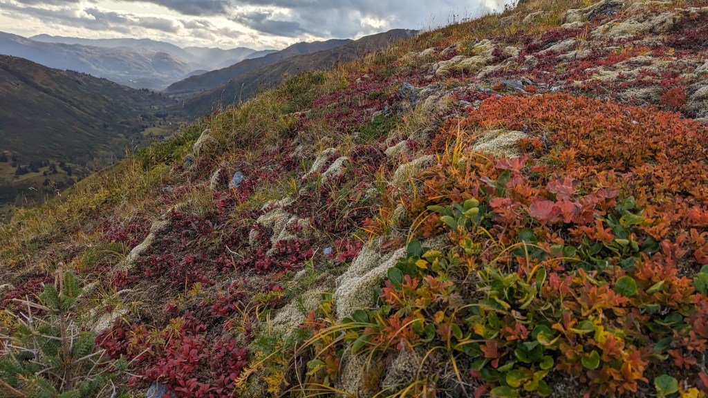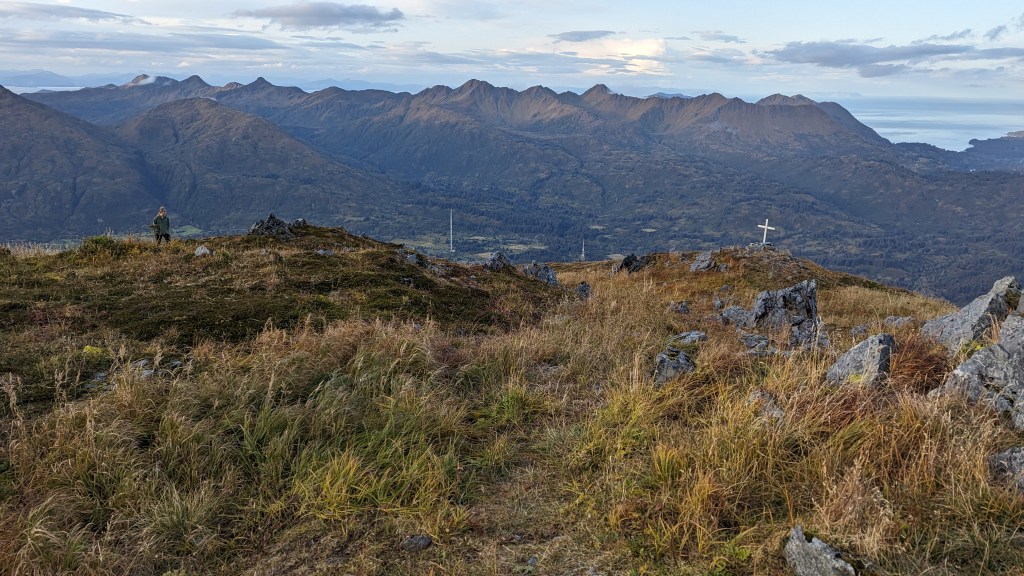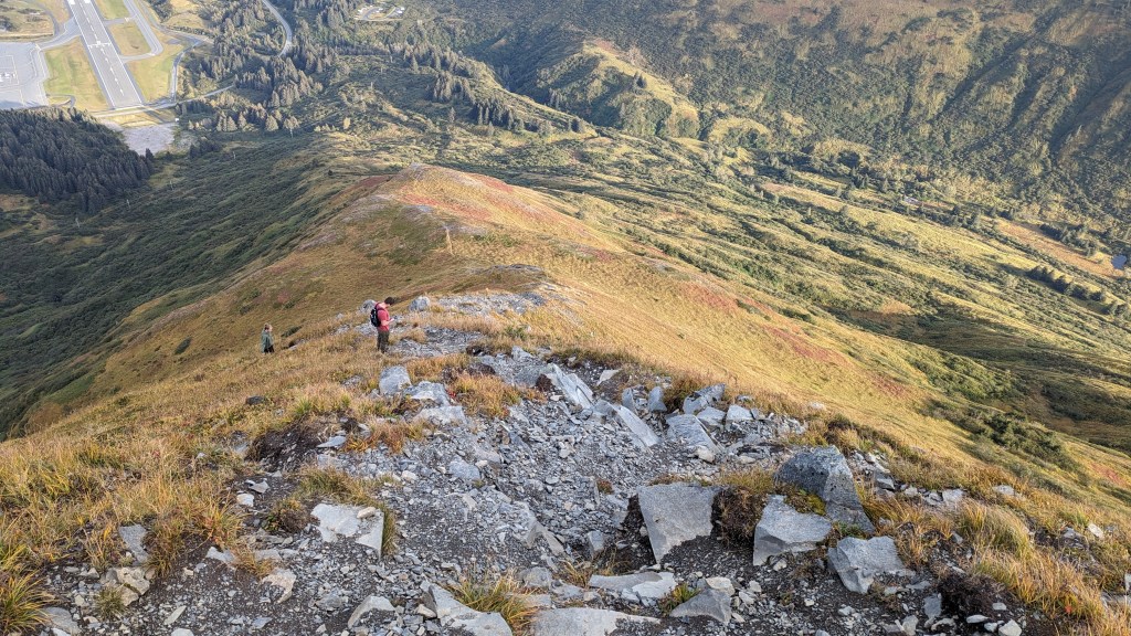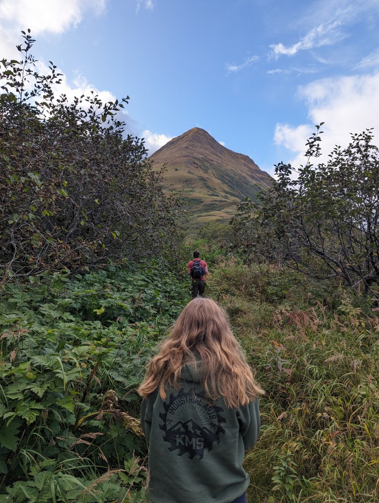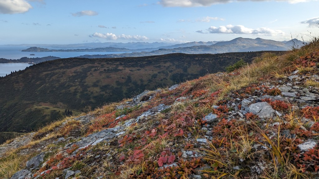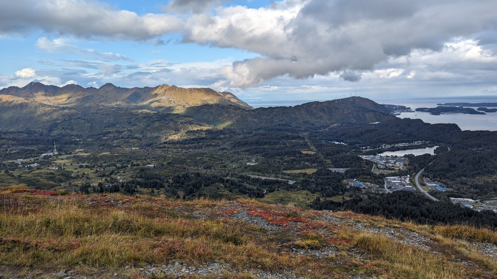 The trailhead is located opposite the pull off just after the airport runway. While on the hike, fall was in full swing! Beautiful red, orange, yellow, and lime green colors covered the mountain. Light clouds could be seen forming on the lee side, creating a mystical feel while looking up the trail. The bottom section of the trail was badly overgrown but still clear to follow. Beautiful inland views of the infinite mountains on Kodiak at the summit. My two friends and I climbed up the very steep trail. It felt like we were climbing to dizzying heights! The airport was in view the whole time until we reached the summit, which was cool but got a bit repetitive after a while. Regardless, awesome hike and I am glad to have checked it off the list.