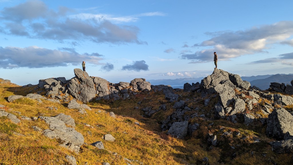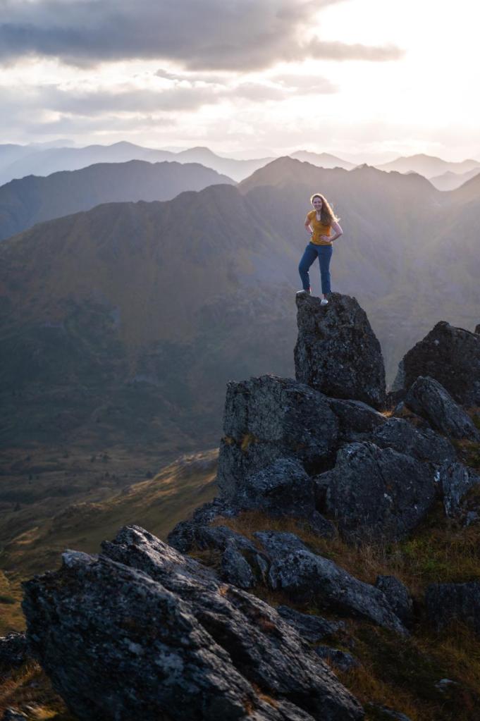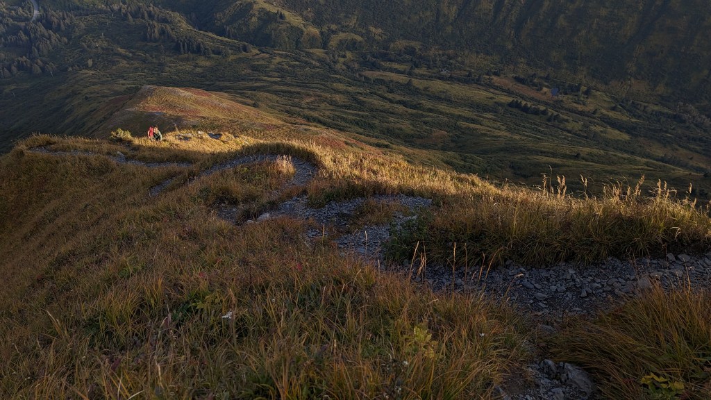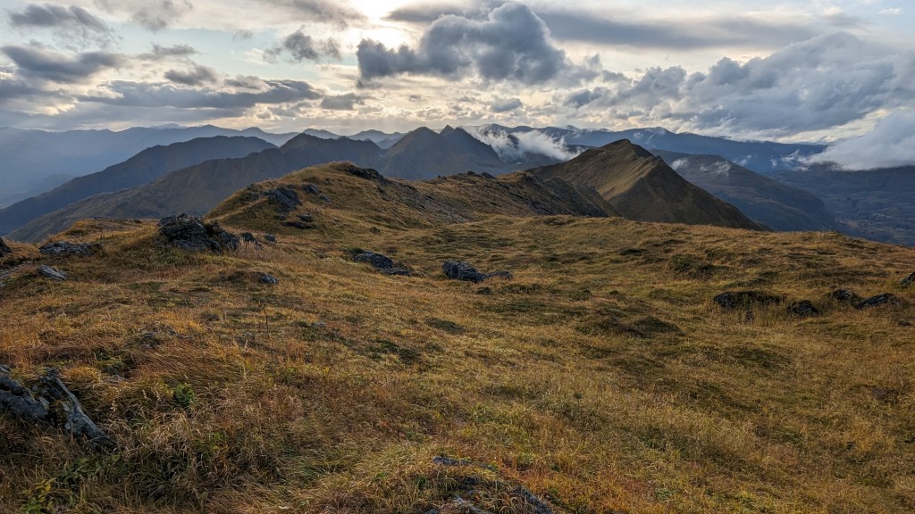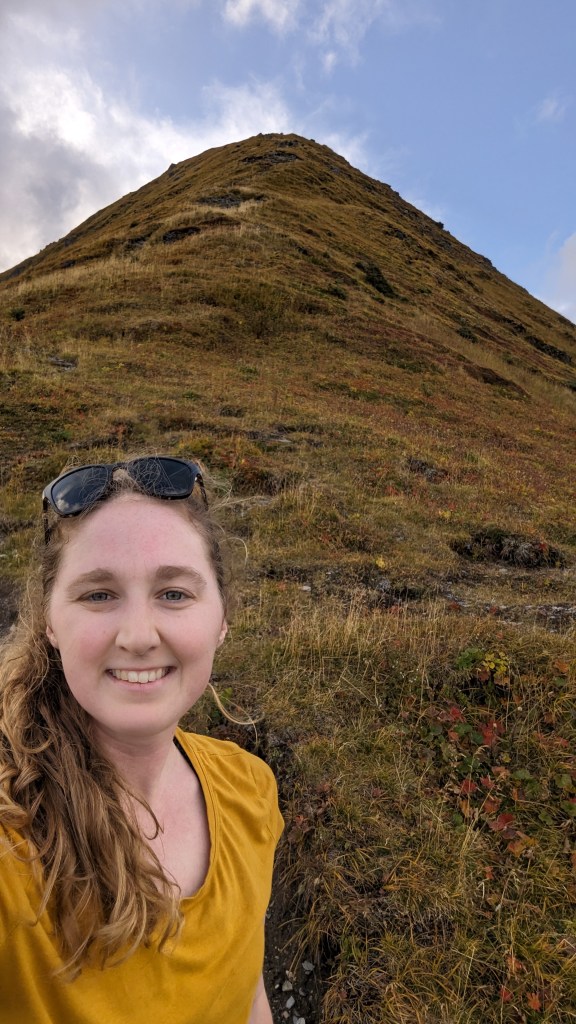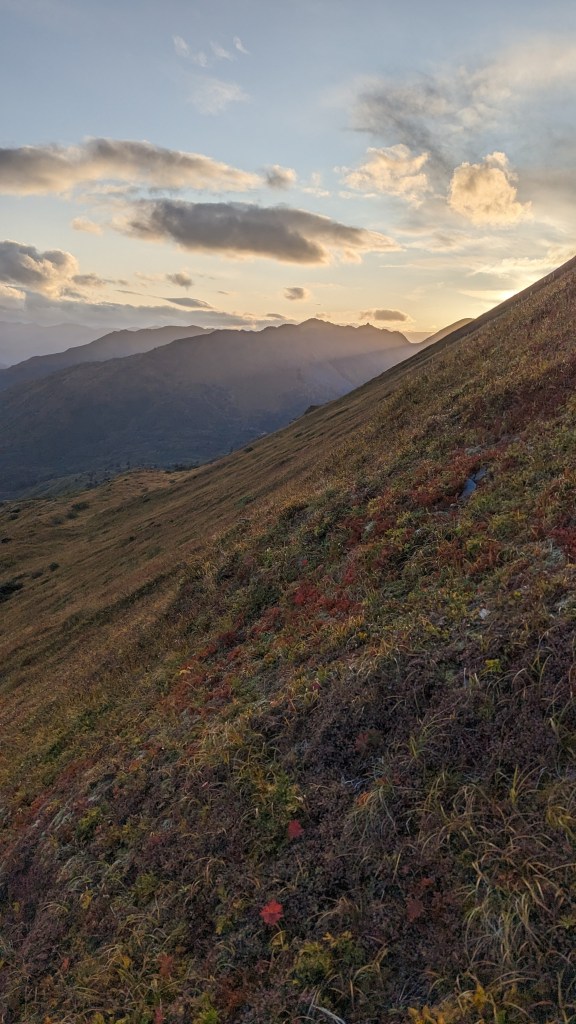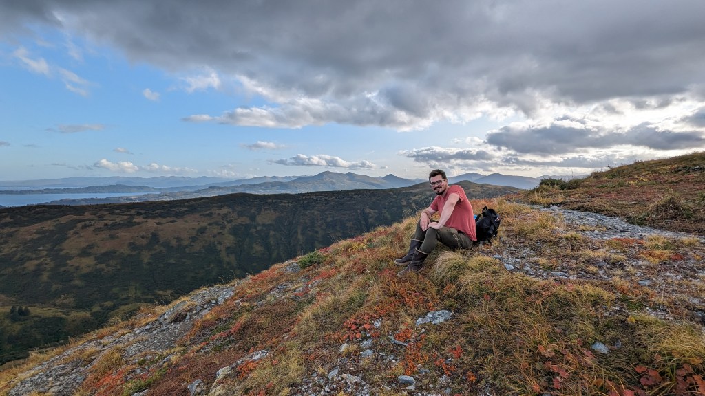 The trailhead is located opposite the pull off just after the airport runway. While on the hike, fall was in full swing! Beautiful red, orange, yellow, and lime green colors covered the mountain. Light clouds could be seen forming on the lee side, creating a mystical feel while looking up the trail. The bottom section of the trail was badly overgrown but still clear to follow. Beautiful inland views of the infinite mountains on Kodiak at the summit. My two friends and I climbed up the very steep trail. It felt like we were climbing to dizzying heights! The airport was in view the whole time until we reached the summit, which was cool but got a bit repetitive after a while. Regardless, awesome hike and I am glad to have checked it off the list.