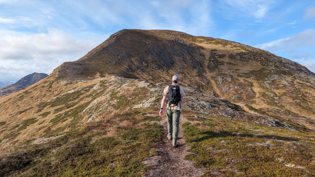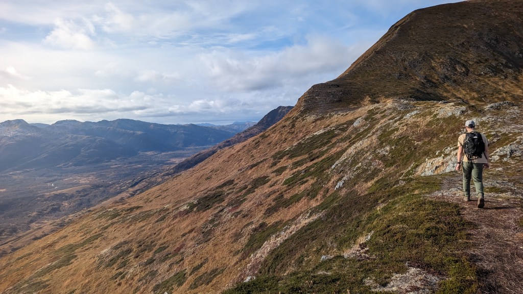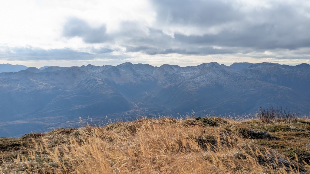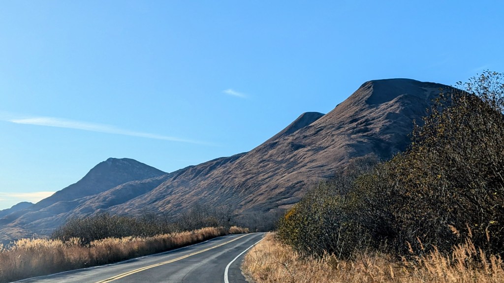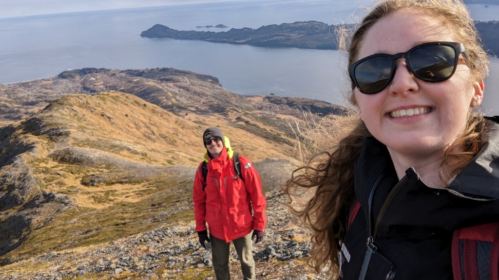 Description: There are two trails to summit Heitman Mt. My good friend, visiting from another Alaska town, and I were in a time crunch, so we hiked the steeper trail. The trailhead for the shorter, steeper, hike is farther down the road towards Pasagshak. It was a beautiful hike, but many little false peaks tricked me, so don’t be fooled! The best part was the final steep ascent to the summit. There we climbed up the exposed east facing shale slope, with wind whipping all around us. It was dramatic and beautiful. The summit is mostly a round flat area where we hung out for a bit. Pretty 360 views of the mountains and water.