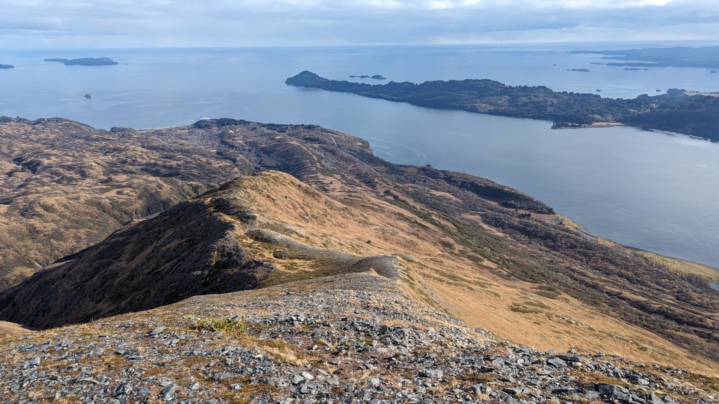 Features: Summit, open meadow, views of the Bay of Chiniak, steep and exposed final ascent.