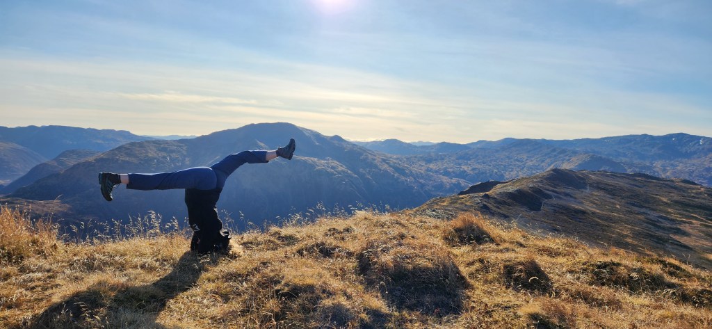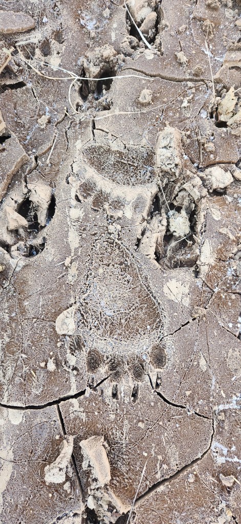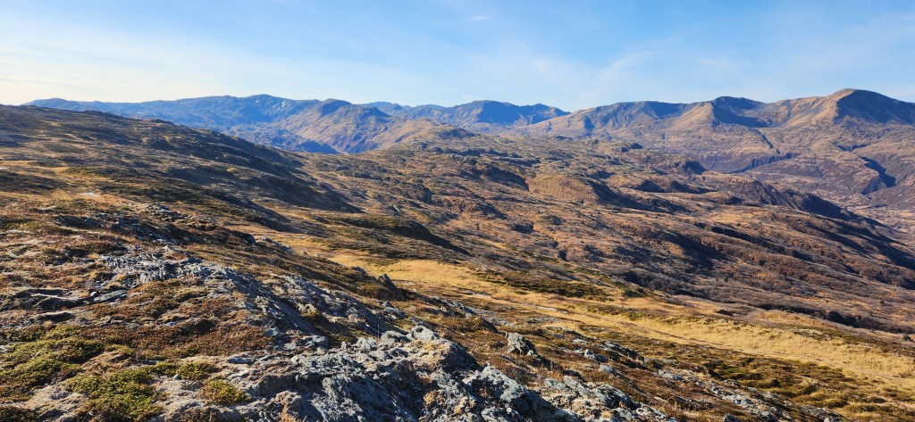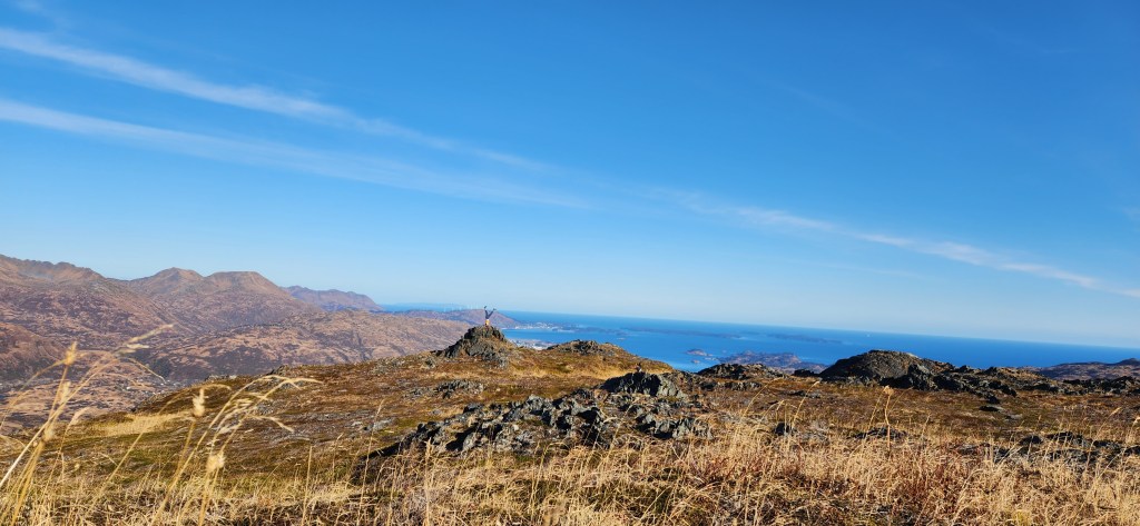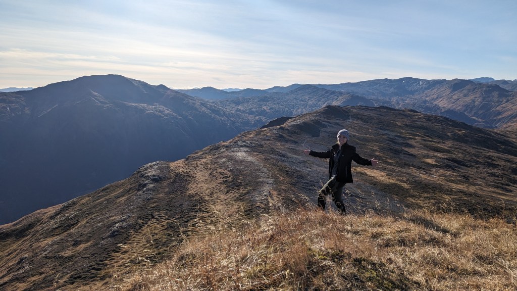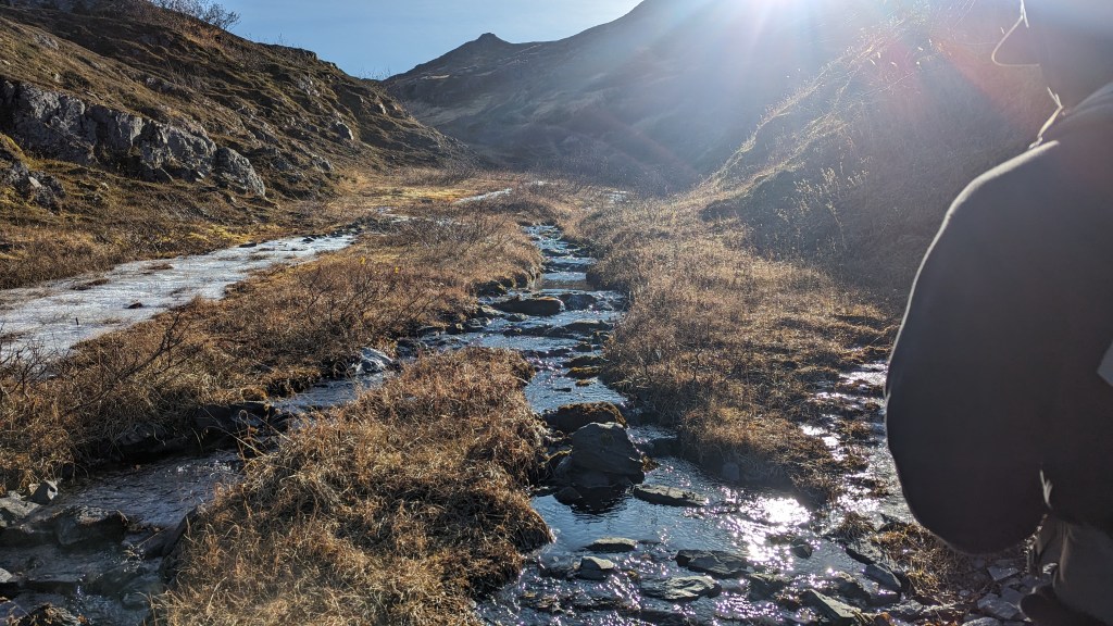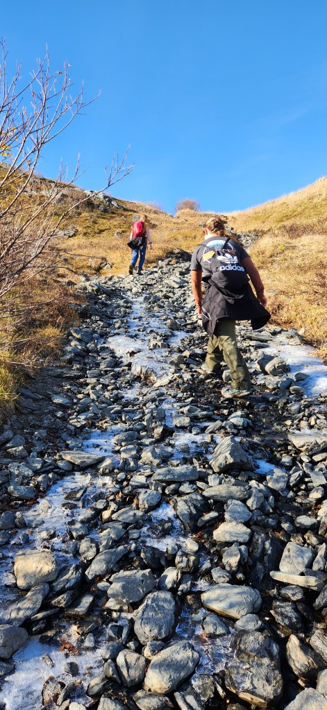 Description: This was the last mountain for me to summit on the Seven Summits list. Squeezed this hike in the day before having to leave Kodiak for a month or two without being able to return until winter. So psyched to finish the Seven Summits before I left! Kashevaroff Mt (Kash) was pretty, sections were covered in frost or frozen water. Near the beginning of the hike, we came across bear tracks frozen into the mud. This was definitely the least aggressive, most sloping, trail of the Seven Summits; you get up roughly the same elevation in nearly twice the distance. There were pretty sloping, grassy hills throughout, with a rockier section to the summit. We passed by a strong stream on the way up and I had to run down to it to dip my feet in the freezing cold water! Climbing higher, we saw beautiful ice from frozen little streams on the trail. Views of Woman’s Bay and inland mountains.