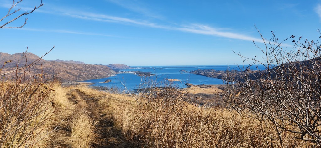 Features: Sloping ascent, ATV trail, access to Center Mountain, views of Woman’s Bay