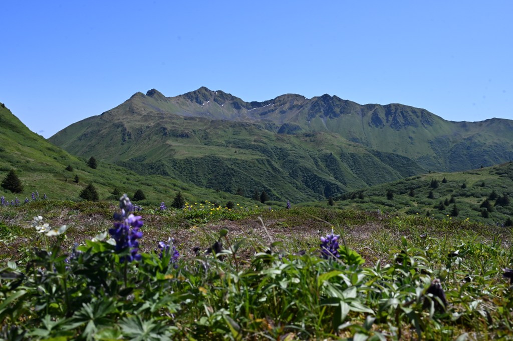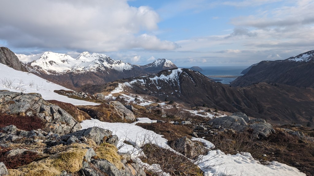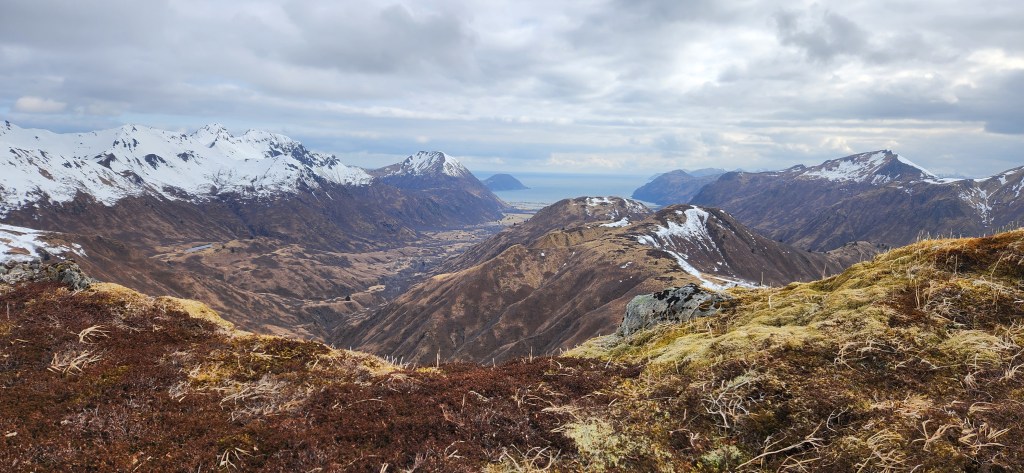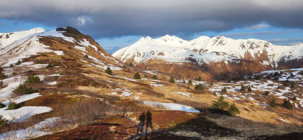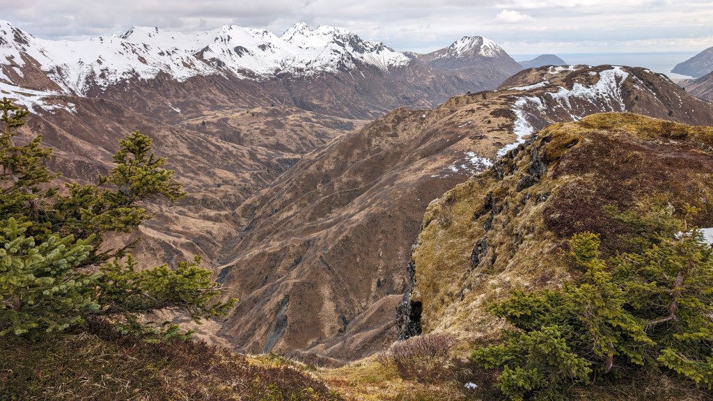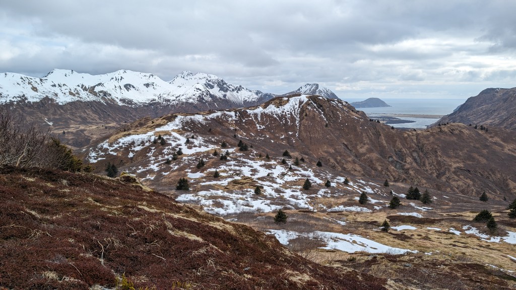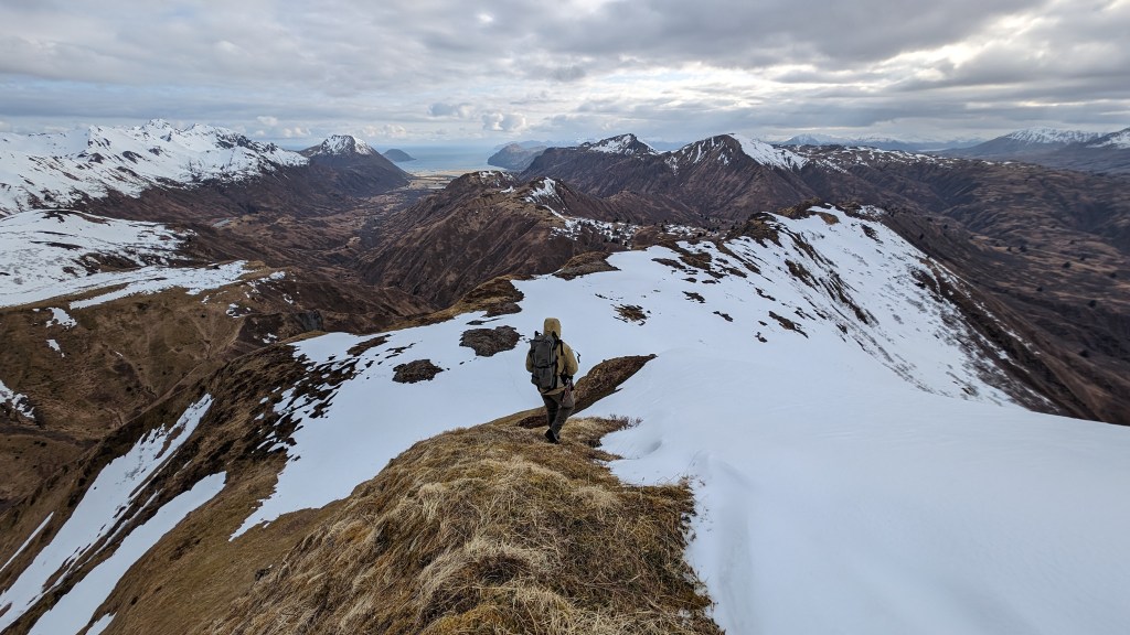 To get to the trail, use a parking pull off approximately 4.2 miles after the T intersection/passing Old’s River Inn. The trailhead is about 100ft past this point on the left. The trail starts out difficult, with partially muddy, steep and consistent incline of about 800-1,000ft. But after reaching the ridge, the trail turns into a gentle-moderate incline. This eventually leads to a peak. Along the ridge are different boulders and cliffs. As you walk along, you will see different views of Chiniak Bay and Pasagshak Bay, along with dramatic ravines and mountains. In May all the inland mountains were still snowcapped and beautiful. We ended our hike at the peak which rose to about 1500ft in elevation. Apparently, there is a way to turn North and connect to another peak farther out. The report of that is linked here. We attempted to do that, but the path either ended in cliffs or too much snow.