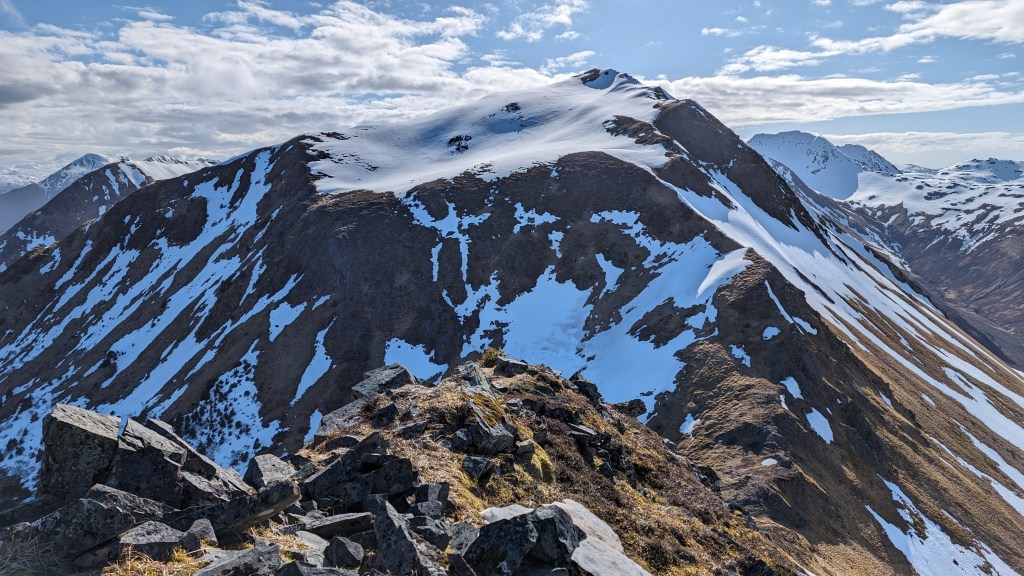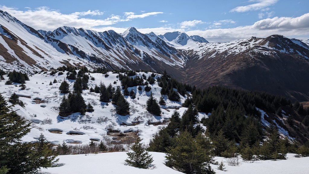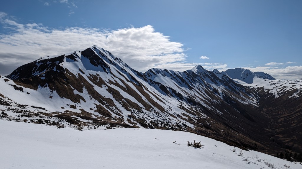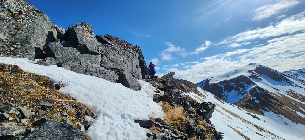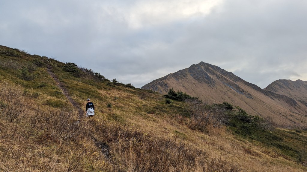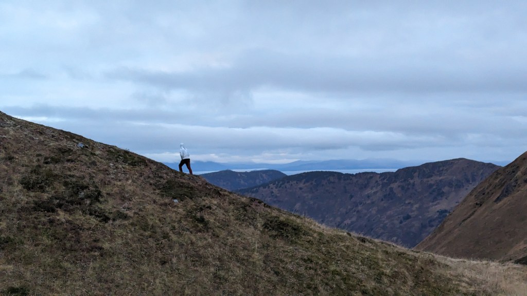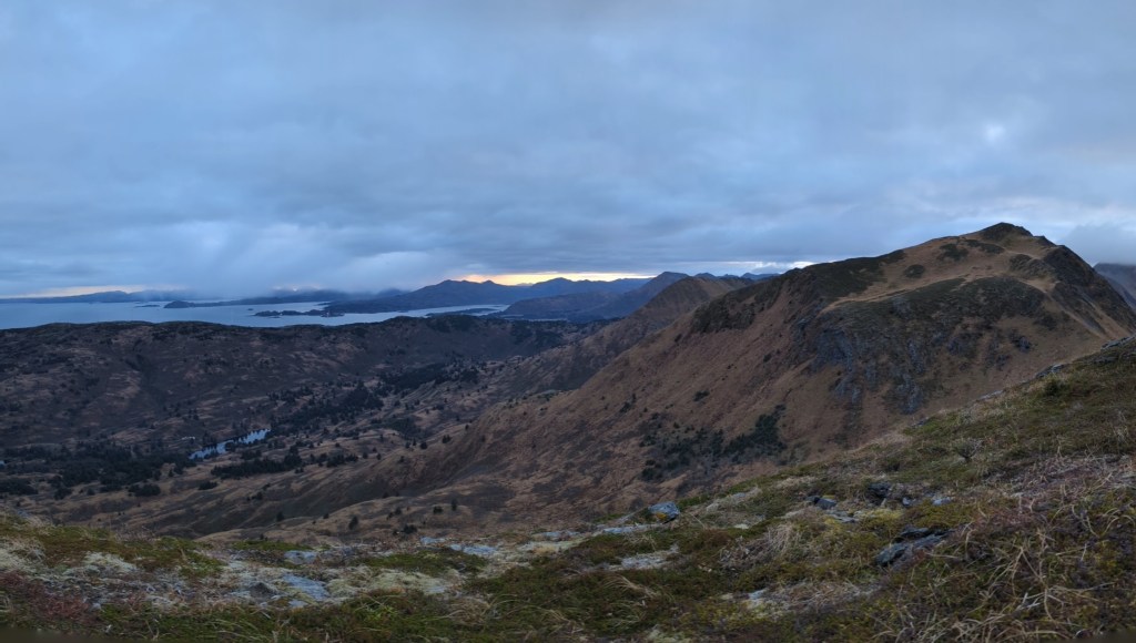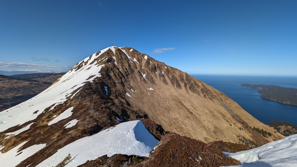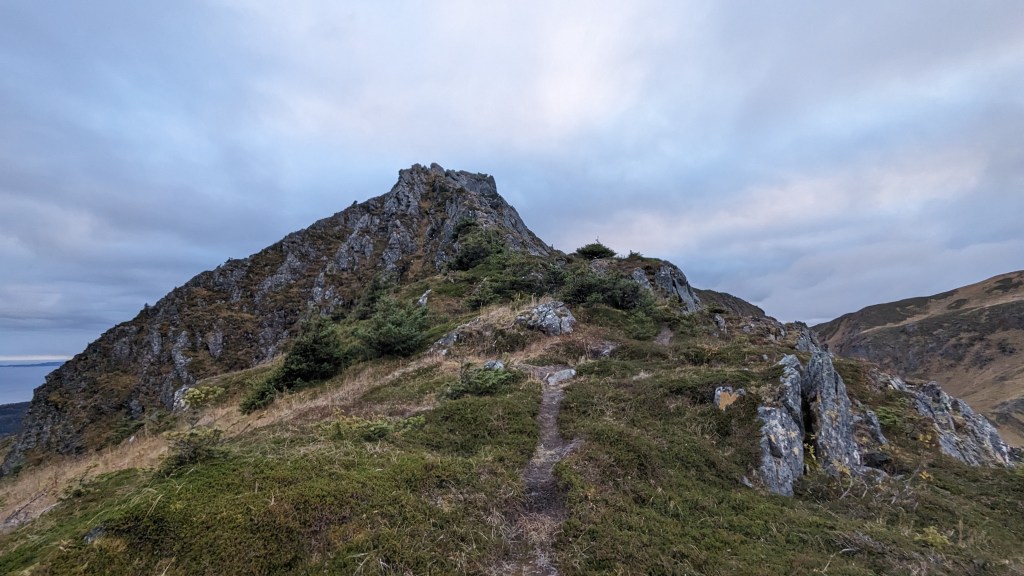 Features: Square-topped summit, rock scramble, open meadow, unmaintained trail, views of North and South Sister Mt., Monashka Bay, and City of Kodiak