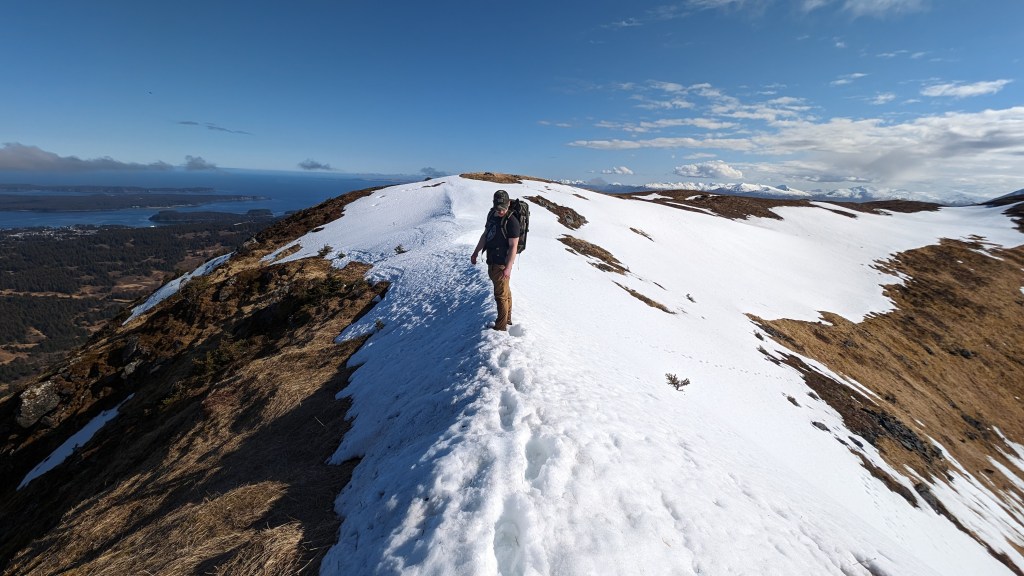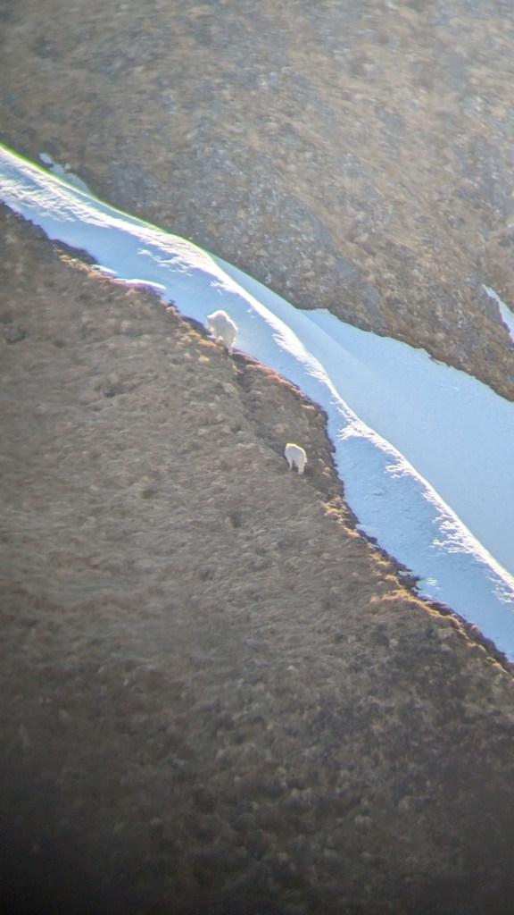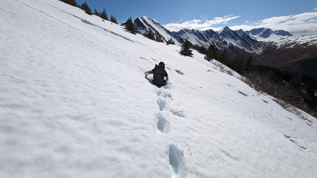 Several feet of snow covered the majority of the trail, beginning after the initial steep incline on the North Sister Trail and continuing until just before the rock scramble up Middle Sister. It was very hard to hike through without snowshoes and we had to make our own trail most of the time since we couldn’t find the normal one with all the snow. We would walk on top the snow for 10-20 seconds before suddenly falling through to our waist. It felt like we were cartoon characters in a comedy, plodding along until BLOOP! One of us would suddenly fall in. The snow also lent itself well to long penguin slides on the way down. Would do it again, but with snowshoes hopefully. This hike included maybe my sketchiest headstand spot… but we also saw about 15 mountain goats on South Sister!