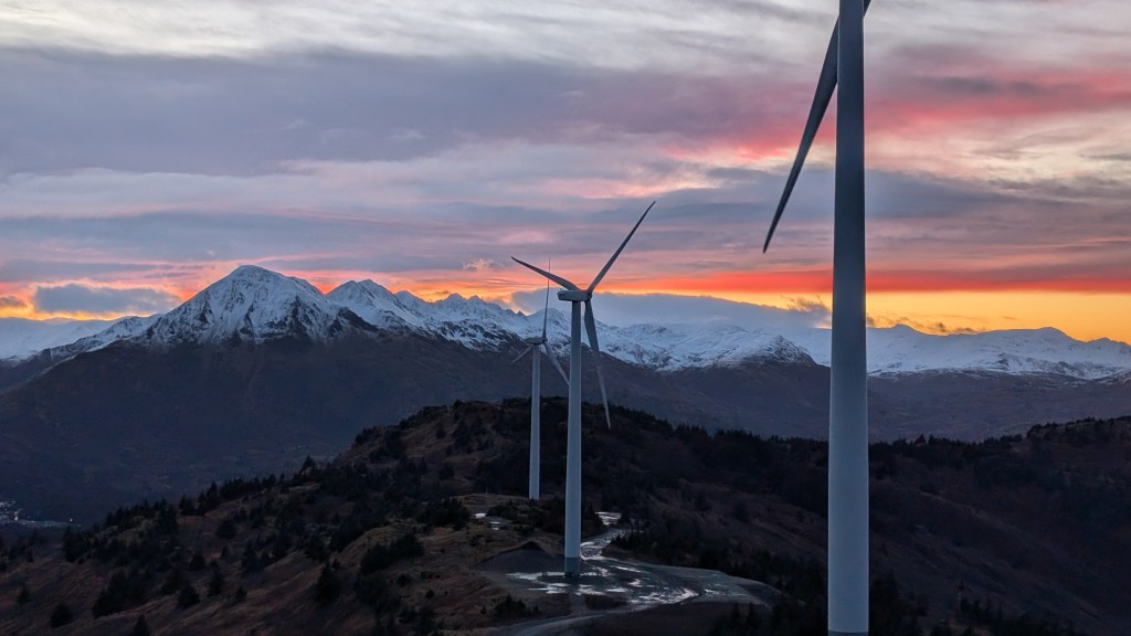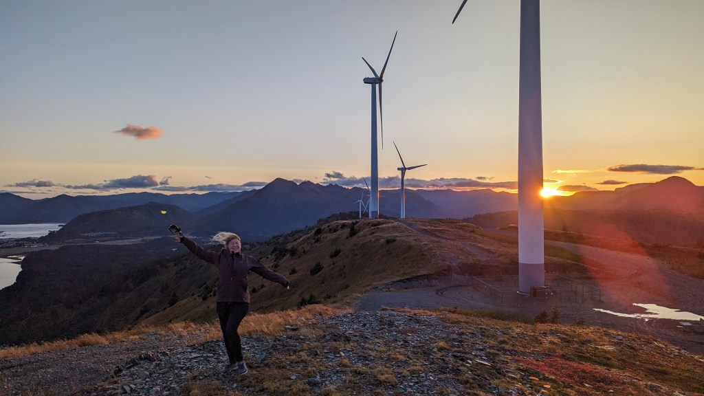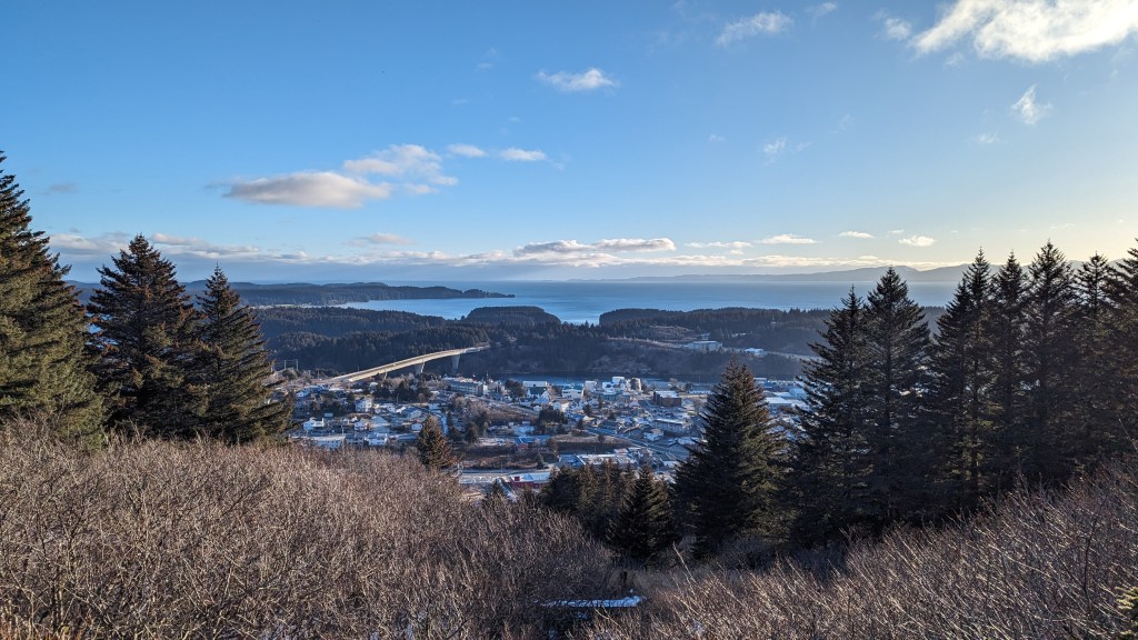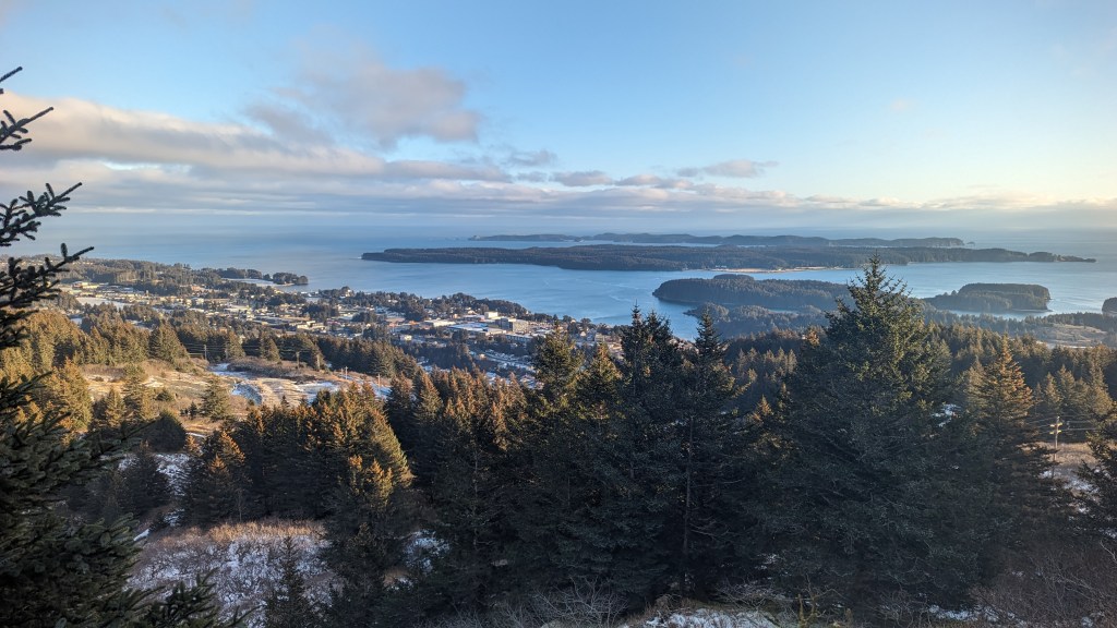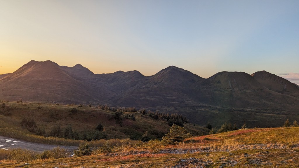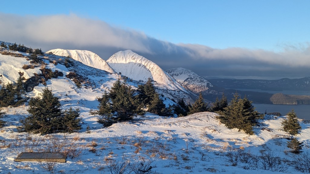 Features: Windmills, views of (in order from right to left) Monashka Mt., Three Sisters, Devil’s Prongs, Pyramid Mt., Barometer Mt., Kashevaroff Mt., also views of town, Near Island, and Chiniak Bay. Road trail or foot trail on the way up, plenty of dirt bike and ATV trails around.