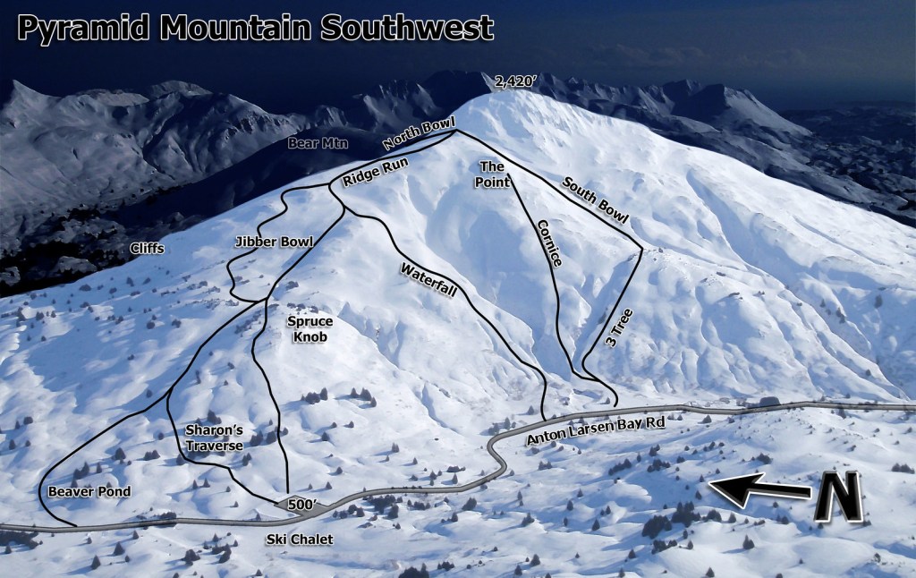 To the left is a map of Pyramid’s Southwest face with some of the runs. This is from a site called Kodiak Snow Report. The photo is a link a page on the website with a bunch of different helpful maps of Pyramid Mt. and surrounding mountains.