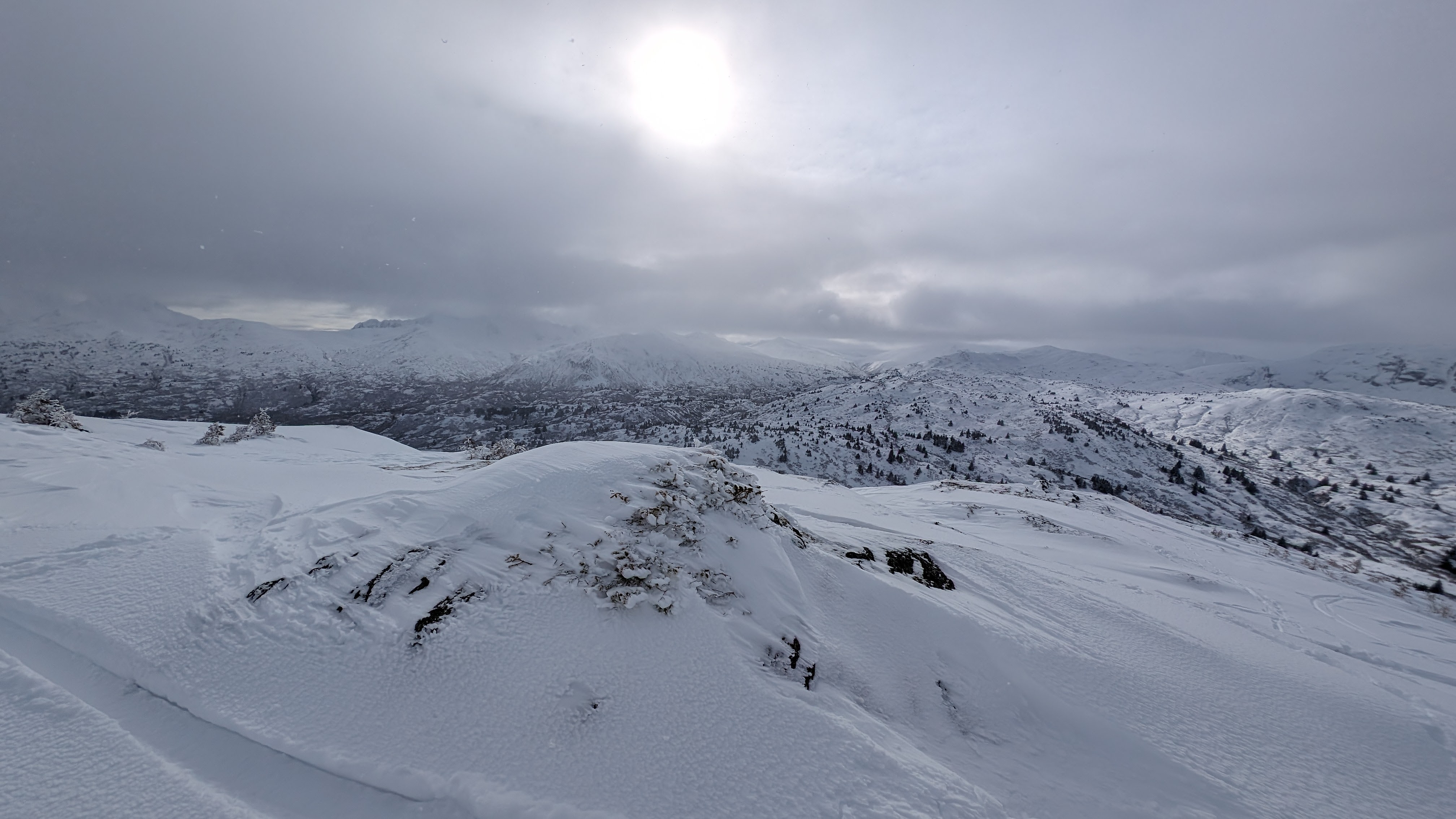 An easy place to start exploring the Kodiak back country would be to start on Pyramid Mt. Park in the parking lot in between the Pyramid Mt. trailhead and the ski chalet. Start skinning up the mountain to the left of the trailhead sign. You can also go up the Pyramid Mt. trail, but it is lumpy and often riddled with tracks from snow shoers and hikers. Skin up the crest of the mountain and stop when reach the sudden climb to the peak. Don’t be fooled by false peaks along the way. Then you can take a nice run down that area and into Jibber Bowl. As you exit Jibber Bowl, make sure to keep making turns to the left so you end up at the parking lot. Otherwise, the slope and other’s trails will spit you out down the road from the parking lot. This is a super common place to back country ski so you will probably see some other Kodiak skiers out there, have fun!
