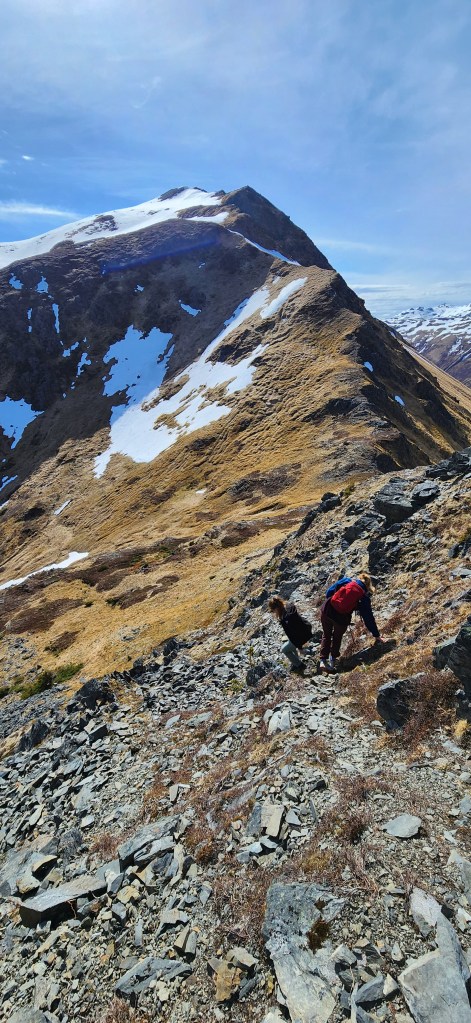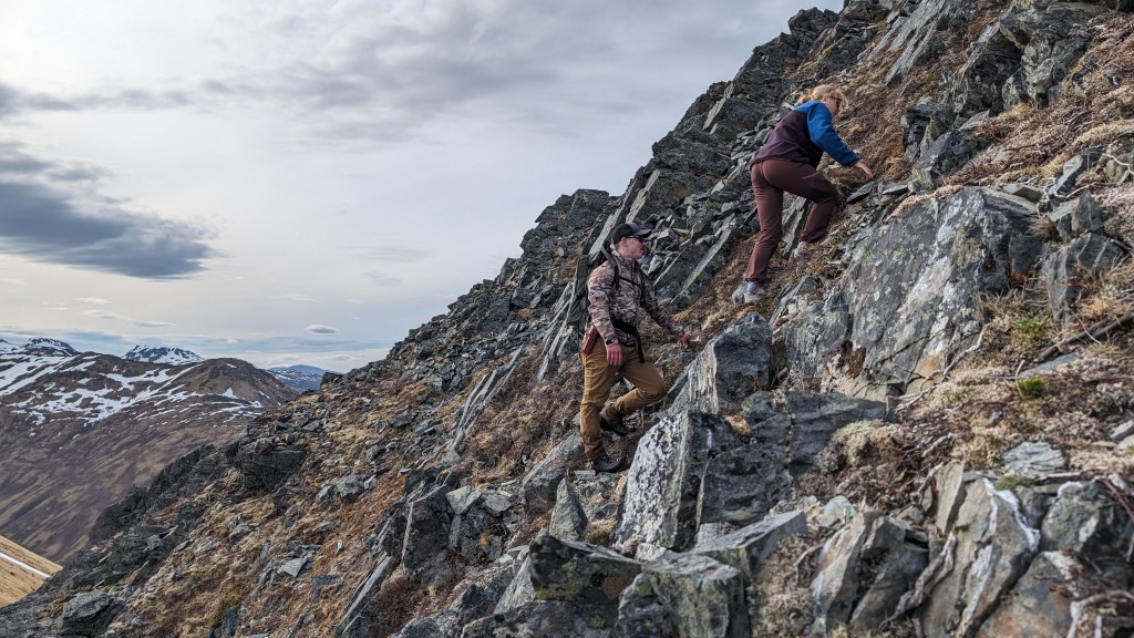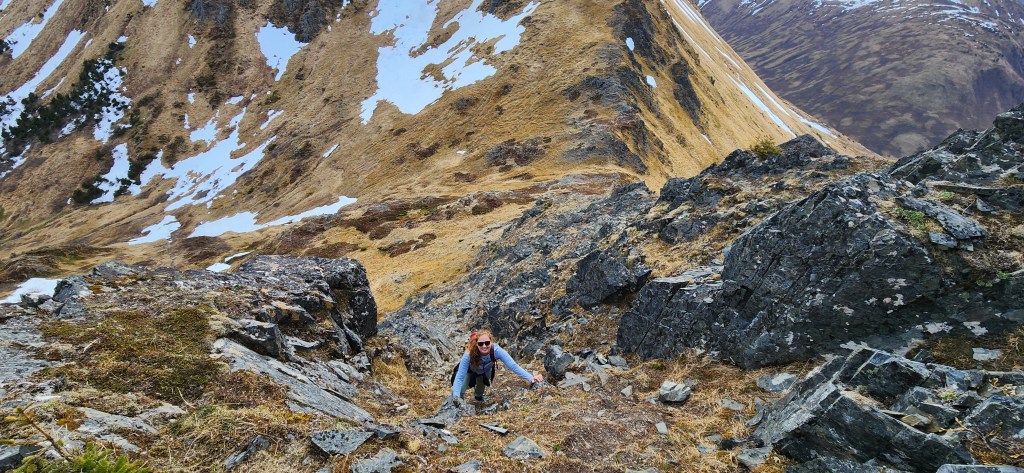 Features: Open meadow, significant and steep rock scrambles, mountain goats, beautiful views of inland mountains.