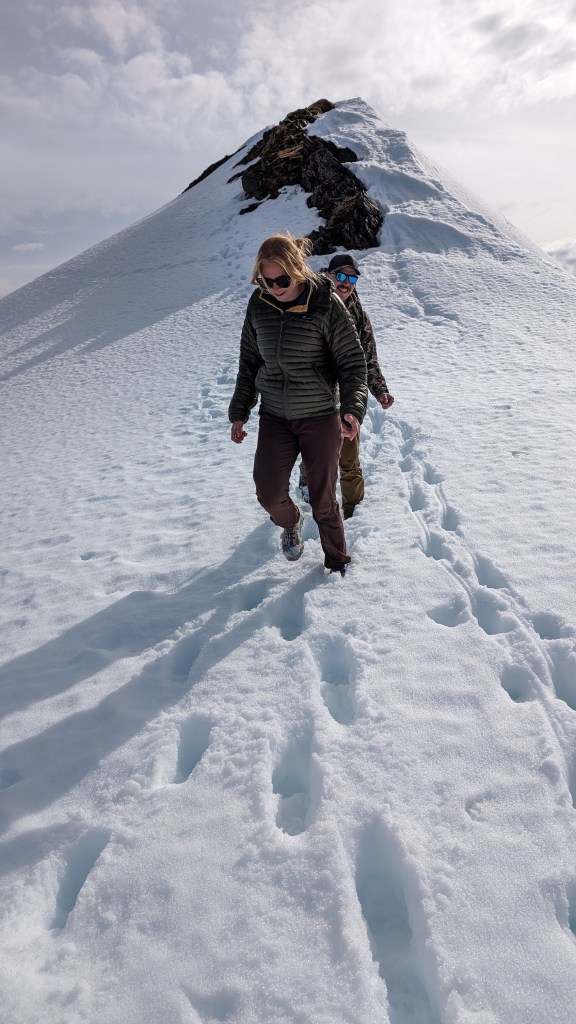 The climb up South Sister was steep and snowy at times, but the view of inland snow-covered mountains was absolutely breathtaking. We took our time taking in the views of both summits because it was stunning, but the hike could certainly be done in much less time. Lots of penguin sliding down the trail was done on the way back down once back on the North Sister trail! Saw several mountain goats at the summit of South Sister.